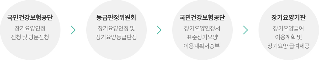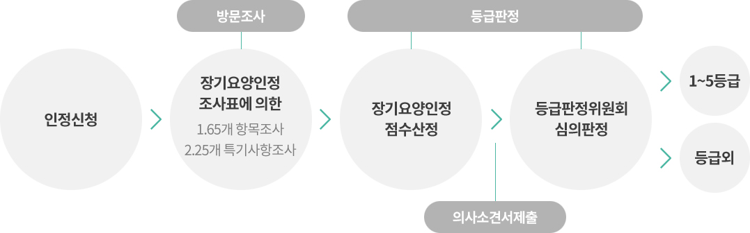 먼저 공단에 장기요양인정신청으로부터 출발하여 공단직원의 방문에 의한 인정조사와 등급판정위원회의 등급판정 그리고 장기요양인정서와 개인별장기요양이용계획서의 작성 및 송부로 이루어집니다.